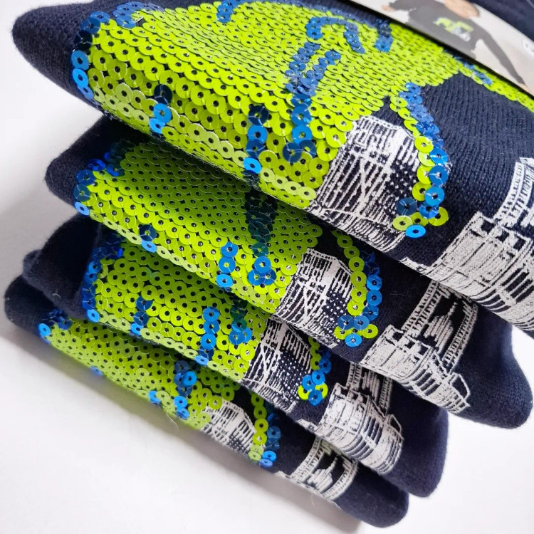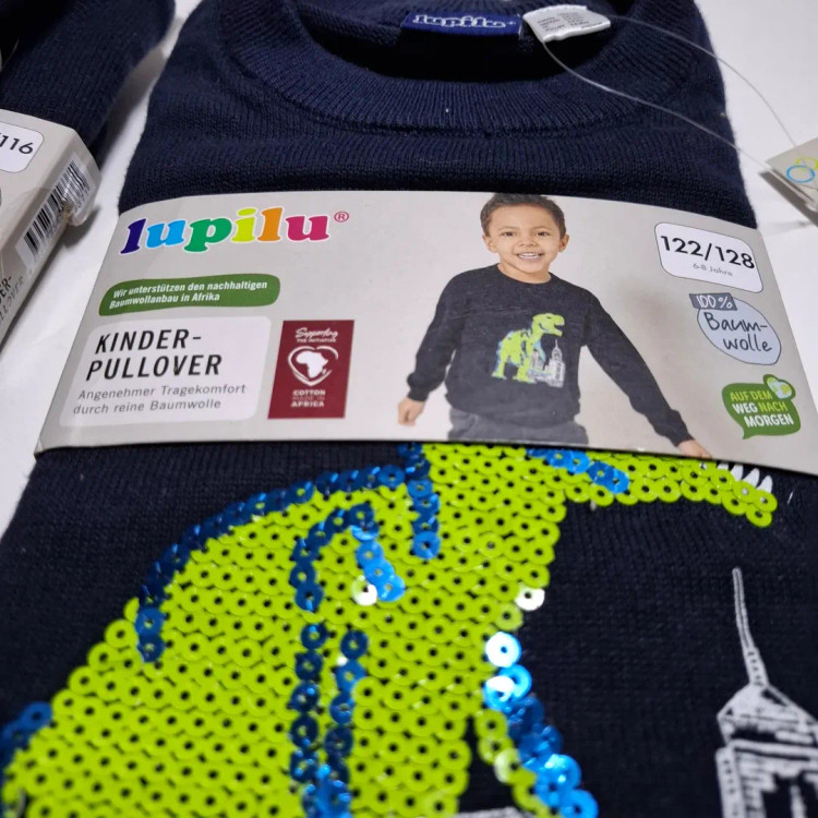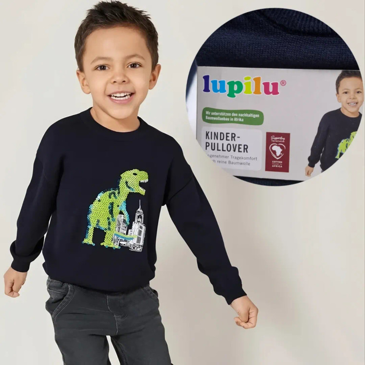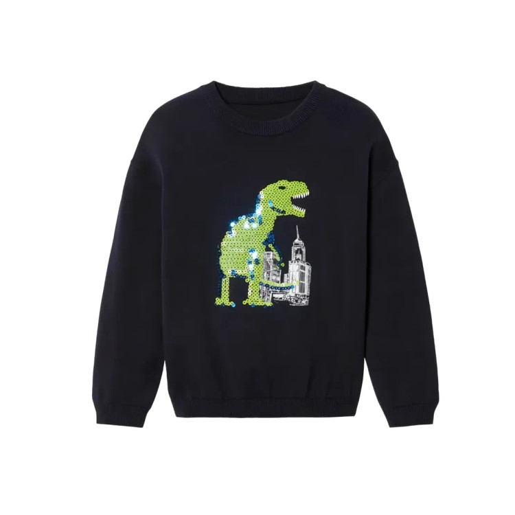 پلیور پسرانه با طرح پولک دوزی دایناسور، جنس ۱۰۰٪ نخ ضدحساسیت و رنگ سورمه ای سیر. اورجینال و دارای استاندارد oekotex اروپا