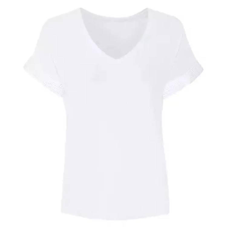 تیشرت زنانه اسمارا تولید آلمان سرآستین توری دوزی بافت متریال؛ ویسکوز و الاستین بسیار نرم و لخت با انعطاف بالا