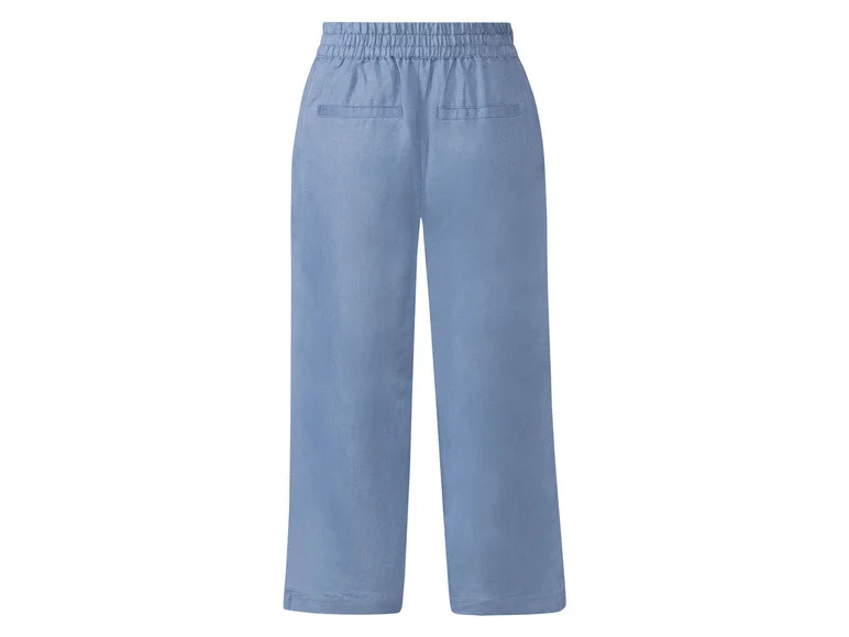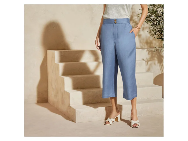جنس پارچه ترکیب الیاف لینن و ویسکوز محصول شرکت لیدل (LIDL) آلمان دارای جیب های جانبی کاربردی کشسانی فقط در قسمت پشتی کمر دارای دکمههای زینتی رنگ زمینه آبی روشن دارای نشان استاندارد OEKO_TEX متریال: ۵۵٪ لینن – ۴۵٪ ویسکوز