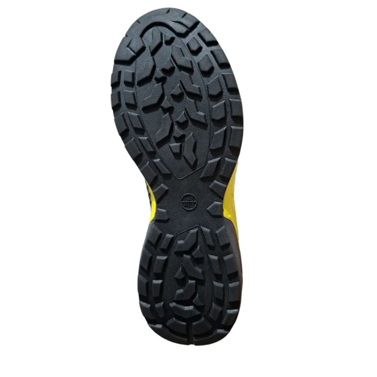 زیرهی این کتونی از جنس پلیاورتان (PU) یا ترموپلاستیک پلیاورتان (TPU) ساخته شده آجدار و عمیق (مناسب برای کوهنوردی، طبیعتگردی یا محیطهای لغزنده) مقاومت بالا در برابر لغزش و سایش انعطاف نسبی، جذب ضربه متوسط نوشته "OIL & ACID RESISTANT" روی زیره، نشوندهنده مقاومت در برابر روغن و مواد شیمیایی سبک هست